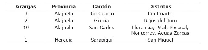 Las granjas participantes en el presente estudio fueron seleccionadas con el propósito de minimizar fuentes de variación externas que, se identificaron con anterioridad al desarrollo del proyecto. En todos los casos, el mecanismo para la reproducción de los animales fue la inseminación artificial, con el equipo y personal entrenado para tal efecto. Todas las granjas fueron seleccionadas de acuerdo con un manejo reproductivo uniforme; durante la fase experimental, el ritmo de extracciones seminales (dos extracciones cada tres semanas) y descanso sexual fue similar. Asimismo, se utilizaron registros físicos y/o digitales para la trazabilidad de los eyaculados de cada animal dentro de cada granja. En el proyecto participaron un total de dieciséis granjas porcinas ubicadas en los cantones de Río Cuarto, Grecia y San Carlos de la provincia de Alajuela, y Sarapiquí en la provincia de Heredia (Cuadro 1).
