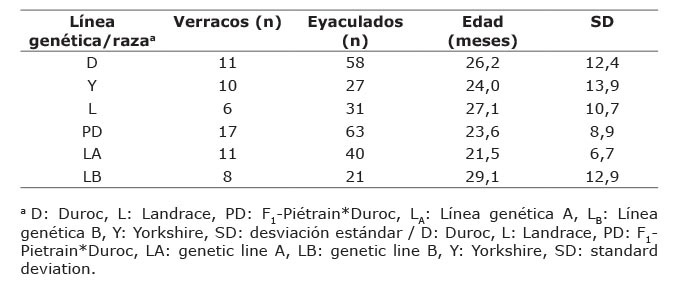 El estudio se realizó en 63 verracos, con edades medias comprendidas entre 23,5 y 25,3 meses (media de 24,4±10,9), que fueron seleccionados de las granjas participantes dentro de la región Huetar Norte, Costa Rica. Todos los animales se encontraban entrenados para la extracción seminal. Los animales se dividieron en grupos según la composición racial. Los grupos raciales se definieron por el pedigrí (en caso de apareamiento controlado dentro de la propia granja) y la procedencia si fue comprado e integrado directamente al núcleo de selección. De esta manera, se identificaron seis grupos raciales: Duroc (D), Yorkshire (Y), Landrace (L), F1 Pietrain*Duroc (PD), línea genética comercial A (LA), que es una selección de la raza Pietrain, y línea genética comercial B (LB), que es una línea seleccionada a partir de cruzamientos controlados con la raza Pietrain. En todos los casos, se tomaron al menos dos eyaculados de cada animal (Cuadro 2). En las granjas existen verracos “abuelos” y “terminales”. Los primeros corresponden a animales cuya progenie se utiliza para obtener reemplazos de hembras dentro de las granjas. Los segundos son verracos cuya progenie (machos y hembras) se utiliza para enviar a mercado.