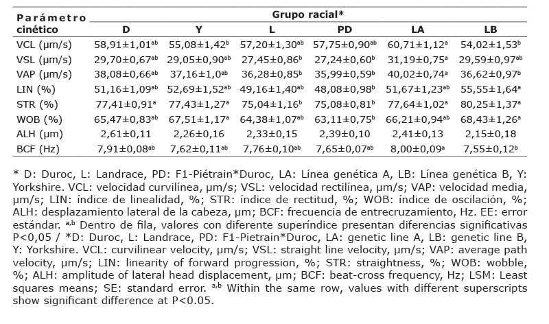 Se encontró un efecto (P<0,05) del grupo racial en los parámetros de cinética espermática, excepto para la ALH. La VCL fue estadísticamente diferente entre la línea genética A y la raza Yorkshire, con una diferencia de medias de 5,63±1,86 μm/s. La línea genética A, también presentó los mayores valores (P<0,05) de VSL y VAP. La VSL fue diferente entre esta línea genética con respecto a la raza Landrace y el F1 Pietrain*Duroc, y no presentó diferencias entre estos dos últimos grupos raciales, mientras que, para la VAP, hubo diferencias entre la línea A y la raza Landrace, el F1 Pietrain*Duroc y la línea genética B. La raza que presentó el mayor índice de linealidad (LIN) fue la línea genética B, mientras que, el menor fue mostrado por la F1 Pietrain*Duroc. No hubo diferencias entre el STR de las dos líneas genéticas (A y B), mientras que, para el WOB, las diferencias estadísticas detectadas fueron entre la línea B y el F1 Pietrain*Duroc, este último presentó el menor índice de oscilación. Para la BCF solo hubo diferencias entre las líneas genéticas A y B (Cuadro 4).