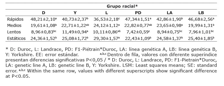 Las razas con mayores porcentajes de espermatozoides lentos fueron Yorkshire y Landrace, con valores de 11,49 y 10,11%. No hubo diferencias (P>0,05) entre el porcentaje de espermatozoides lentos en la raza Duroc, F1 Pietrain*Duroc, línea A y línea B. La raza Landrace presentó el mayor porcentaje de espermatozoides estáticos (29,30%; P<0,05) con respecto a los demás grupos raciales (Cuadro 5).