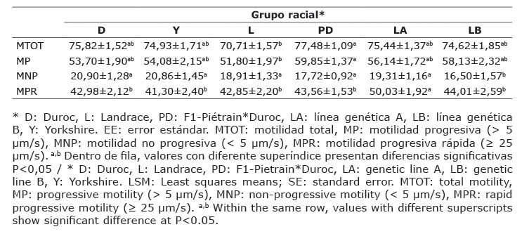 Los grupos raciales que más se diferenciaron (P<0,05) en los valores de motilidad total y progresiva fueron F1 Pietrain*Duroc y Landrace, con una diferencia de medias de 6,77% y 8,05%, respectivamente, mientras que, para los demás grupos raciales no hubo diferencias (P>0,05). La línea genética B presentó los valores menores de espermatozoides mótiles no progresivos con un valor de 16,50%, mientras que, para los demás grupos raciales no se presentaron diferencias (P>0,05). La línea genética A presentó el mayor valor (P<0,05) de espermatozoides mótiles progresivos rápidos; para los demás grupos raciales no hubo diferencias significativas y el rango de valores varió entre 41,30 y 44,01% (Cuadro 6).
