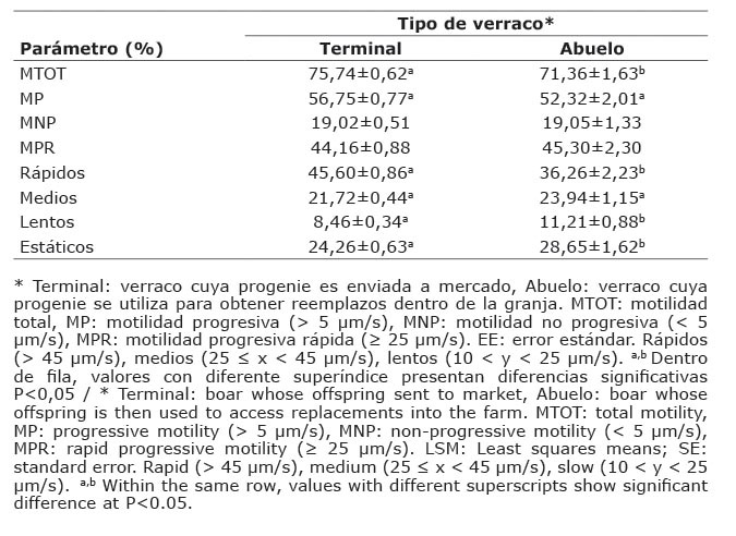 Hubo un efecto (P<0,05) del tipo de verraco sobre la movilidad espermática en variables como la motilidad total, la motilidad progresiva y sobre la clasificación de espermatozoides en rápidos, medios, lentos y estáticos.