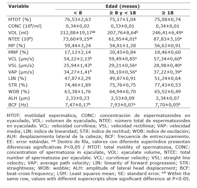 La VSL y la VAP fueron menores (P<0,05) en los verracos jóvenes (< 8 meses), sin embargo, la VCL fue mayor (P<0,05) en los de edad intermedia (≥8 y <18 meses), y no se detectaron diferencias entre los verracos menores de 8 meses y los mayores de 18 meses. Estos resultados plantean la idea de que es necesario considerar la diferenciación por edad para verracos muy jóvenes (menores de ocho meses) con respecto a los parámetros cualitativos de la motilidad de los espermatozoides (Schulze et al., 2014). Los verracos jóvenes, en comparación con los adultos, frecuentemente presentan una calidad de esperma más variable, lo que coincide con lo encontrado en este trabajo, se considera preferible proceder con la selección solo después de tres o cuatro evaluaciones seminales, ya que, la pubertad de un verraco comienza a la edad de 4,5-5,5 meses, mientras que, su madurez sexual a los 7-8 meses (Schinckel et al., 1983).
