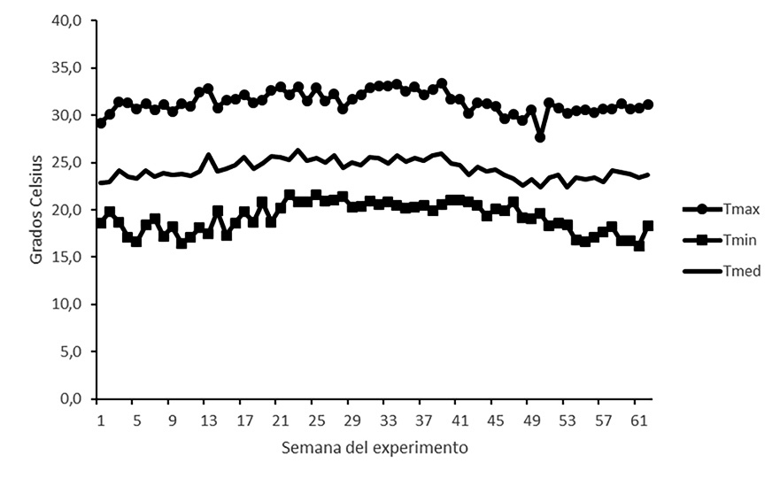Figure 2. Average weekly maximun (Tmax), minimun (Tmin) and mean (Tmed) temperatures from January 2011 to February 2012 in Guapiles, Pococi, Costa Rica.