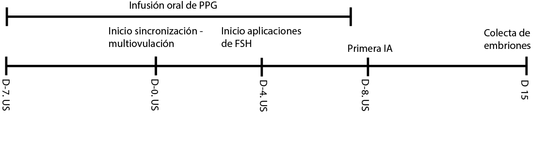 Se realizaron seis colectas de embriones (seis repeticiones) en las siete hembras, con un intervalo entre colectas de al menos cuarenta y ocho días. El tratamiento aplicado consistió en una infusión oral de 300 ml de PPG (pureza > 99,8%) el cual se suministró durante quince días, siete antes (-7) de iniciar, el día 0 (inicio de protocolo de sincronización de celo y multiovulación) y hasta el día 7 de tratamiento (día de finalización de aplicación de la hormona superestimulante, FSH). Hubo al menos 105 días entre las colectas de los animales que les correspondía el tratamiento con PPG. La forma de administración del PPG fue oral, mediante una jeringa de 300 ml con una cánula de 25 cm. La línea de tiempo del diseño del experimento de la suplementación con PPG y los días de evaluación se observan en la Figura 3. Durante los días de evaluación con ultrasonido (US) se observaron los ovarios de las vacas.