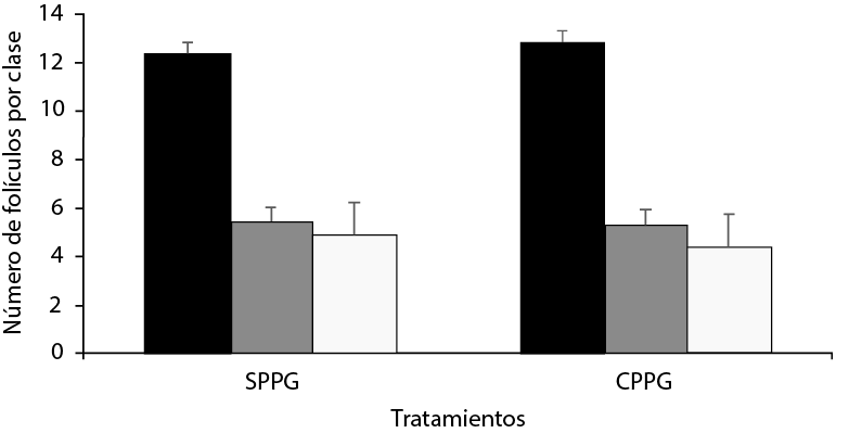 A pesar de que el PPG es un suplemento gluconeogénico (Chagas et al., 2007), y que los ovarios son glucodependientes (Peter et al., 2009), la suplementación con PPG no afectó la respuesta ovárica a los tratamientos multiovulatorios cuando se evaluó el número de folículos presentes por clase, por medio de ultrasonografía. Se observó una interacción entre el tratamiento y la repetición para los folículos clase 3, pero no se puede atribuir a los tratamientos, puesto que los datos fueron inconsistentes. Esto se debe probablemente a factores ambientales que afectaron la respuesta ovárica a través de las repeticiones.