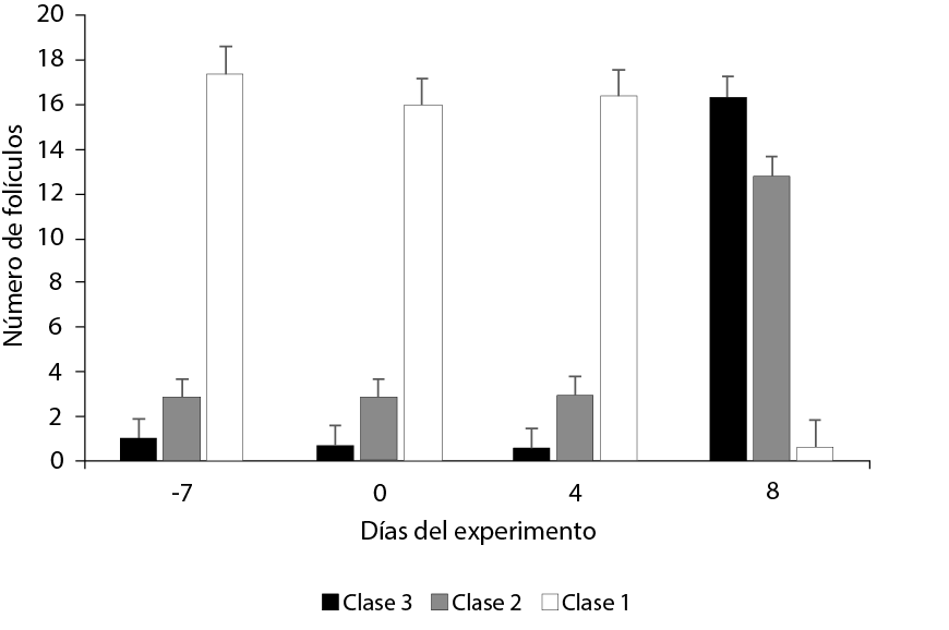 El día del tratamiento en que se realizó la ecografía, afectó significativamente la población folicular de todas las clases (P<0,0001). Esto era esperado en respuesta al protocolo de sincronización y multiovulación utilizado. Los promedios de la cantidad de folículos por clase en cada día de evaluación se aprecian en la Figura 5.