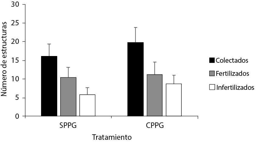 A pesar de la inconsistencia de los resultados, el número de estructuras colectadas, fertilizadas (embriones) e infertilizadas (ovocitos), según el tratamiento, presentó diferencia numérica en cualquiera de las estructuras a favor del tratamiento con PPG.