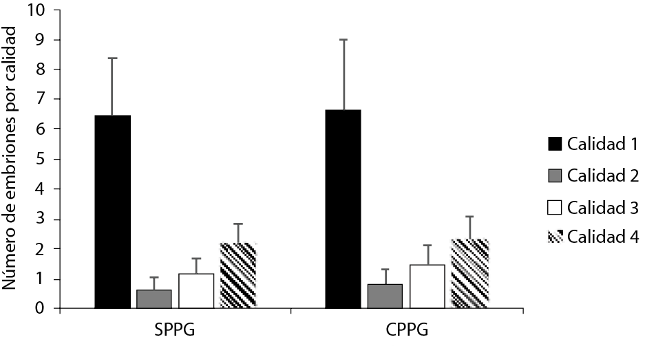 El tratamiento con PPG generó resultados similares al control en cuanto a la evaluación de estructuras colectadas (P= 0,48 para el total de estructuras colectadas; P=0,85 para el total de estructuras fertilizadas; P= 0,94 para el total de embriones clasificados como calidad 1; P=0,49 para el total de embriones calidad 1 en estado de mórula; P=0,36 para el total de embriones calidad 1 en estado de blastocito; P>0,05 para embriones clasificados como calidad 2, 3 y 4; P=0,35 para el total de estructuras infertilizadas). En la Figura 6, se presenta la distribución en los tratamientos de las estructuras colectadas, se muestra además, el número de estructuras fertilizadas e infertilizadas. En la Figura 7, se desglosa el número de estructuras colectadas (embriones) de acuerdo con su calidad dentro de cada tratamiento. En el presente estudio se determinó que las calidades de los embriones fueron similares independientemente del tratamiento.