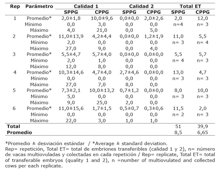 La cantidad de embriones transferibles (calidad 1 y 2, según clasificación recomendada por Bó y Mapletoft (2013), se presenta en el Cuadro 1; se observa para los embriones transferibles la cantidad promedio absoluta por cada repetición del experimento, con sus valores máximos y mínimos. Además, se presenta el número de animales (n) en cada repetición para cada tratamiento.