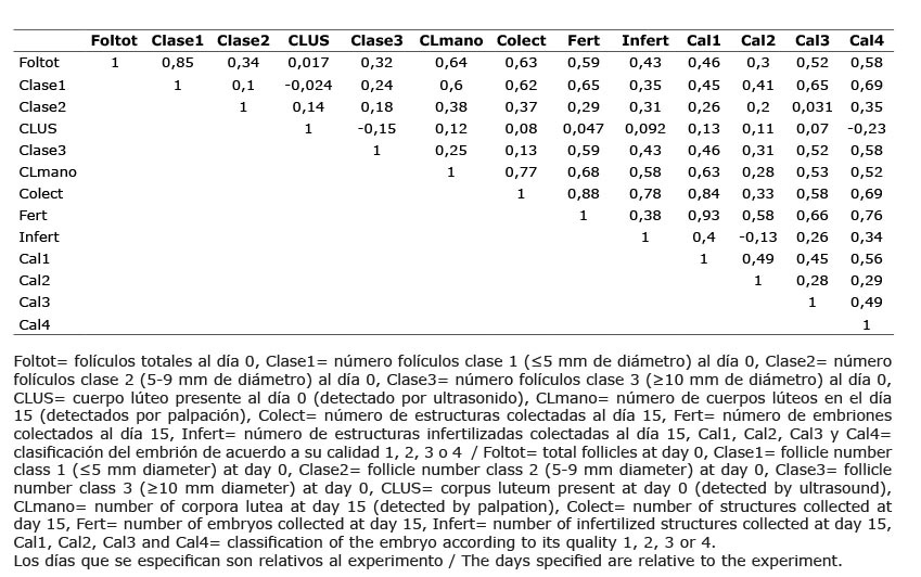 Se encontró que conforme aumentó el número de estructuras colectadas, el número de embriones totales y el número de embriones calidad 1 también aumentaron (r=0,88 y r=0,84, respectivamente), sin embargo, cuando aumentó el número de estructuras totales colectadas, también aumentó considerablemente el número de estructuras infertilizadas (r=0,78). La correlación más alta que se encontró fue entre el número de embriones totales y el número de embriones calidad 1 (r=0,93).