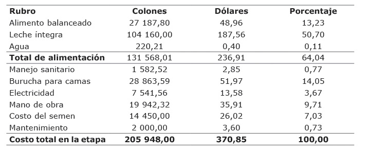 En un estudio realizado por Elizondo-Salazar y Vargas-Ramírez (2015) se reportó un costo de ¢221 287,88 ($398,47), en animales Holstein destetados a los cuatro meses de edad. Dichos autores indicaron que el rubro de mayor impacto en esta etapa resultó ser la alimentación con un 64,45%, del cual un 24,57% correspondió al gasto de alimento balanceado, seguido por el concepto de lactoreemplazador y leche íntegra, los cuales representaron un 20,53 y 13,76%, respectivamente. La mano de obra requerida para el cuido de los animales resultó ser el segundo costo de mayor importancia con una ponderación del 18,89%.