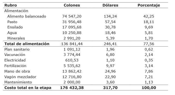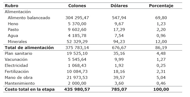 Los costos establecidos para la etapa que va del destete a los dieciséis meses se presentan en el Cuadro 2. En esta etapa, el rubro de alimentación representó el 86,19% del gasto, del cual el alimento balanceado tuvo una ponderación del 69,80%. El segundo costo que más influyó en esta etapa fue la mano de obra que representó un 5,04% de los costos totales de la etapa. El costo total para la etapa fue de ¢435 980,57 ($785,07), lo que representó un costo diario de ¢1103,19 ($1,99).