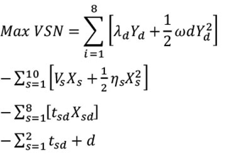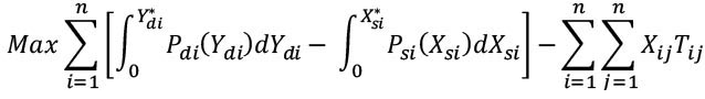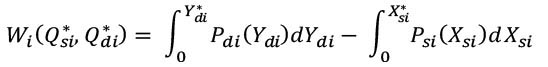 La función de cuasibienestar social para cada región, se definió por el área entre la curva de demanda y el área entre la curva de oferta (donde y son las cantidades óptimas por obtener) [1]: