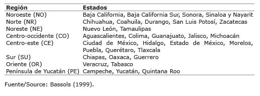 Se utilizó un modelo de equilibrio parcial, con programación no lineal (programación cuadrática), sin almacenamiento, cuya función objetivo (función de valor social neto) fue maximizar el área bajo las curvas de demanda, menos el área bajo las curvas de oferta, menos los costos de comercialización, tanto de la carne de cerdo en canal nacional como de la importada, sujeta a un conjunto de restricciones de oferta y demanda. El modelo se aplicó al mercado nacional de la carne de cerdo en canal, con datos observados en 2015. Para ello, con base en Bassols (1999), el país se dividió en ocho regiones productoras y consumidoras (Cuadro 1), más dos puntos de internación de las importaciones, mismos que se agregaron a la matriz de regiones productoras, sumando un total de diez.