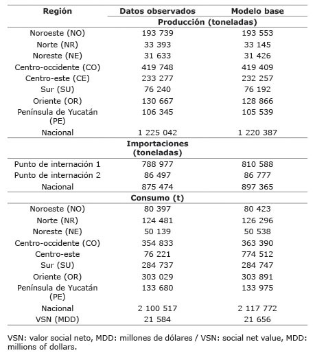 Al realizar el contraste de los datos observados (Cuadro 2), esto es, la información oficial del Gobierno, con los resultados del modelo de optimización, llamado modelo base o modelo óptimo; este último subestimó a la producción nacional y regional en 0,4% e indica que el volumen nacional de producción óptima fue menor al observado en 4655 toneladas. El resultado del modelo óptimo fue, suficientemente cercano a lo observado en ese año (2015), por lo que las conclusiones que de él se deriven deben considerarse aceptables, así como recomendaciones sobre aplicación de diversos escenarios de política.