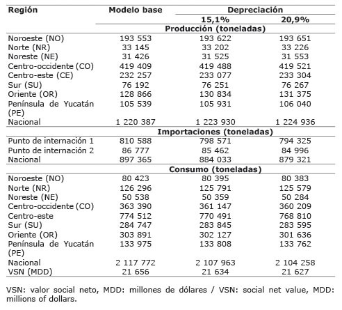 Al 15,1% de tasa de depreciación y con el fin de maximizar el valor social neto a ese nivel de política, habría generado una redistribución tanto de la producción nacional como de las importaciones. Por ejemplo, de toda la producción e importaciones que el modelo asignó de forma regional, la región Noroeste, que recibiría 193 622 toneladas de carne de cerdo en canal, de las cuales 41,5% lo consumiría en la misma región y enviaría el 58,5% a la región centro-oeste.