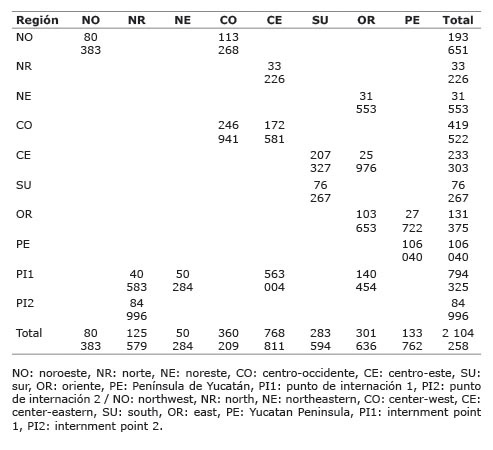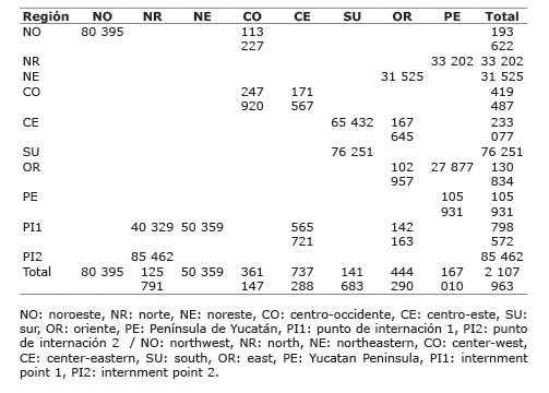 Las importaciones que entran por el punto de internación uno (798 572 toneladas), se habrían reasignado en 10,7% para la región norte, 6,3% en la noreste, 70,8% en la centro-este y el resto en la región oriente. En el caso de la región península de Yucatán, el modelo sugiere que toda su producción e importaciones se consuman en la misma región (Cuadro 4). El análisis es similar para el resto de las regiones.
