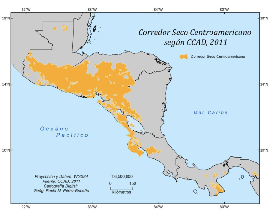 El CSC es una región que se extiende por la costa Pacífica de América Central, desde Chiapas, México, en una franja que abarca las zonas bajas de la vertiente del Pacífico y gran parte de la región central premontana (0 a 800 msnm) de Guatemala, El Salvador, Honduras, Nicaragua y parte de Costa Rica (hasta Guanacaste); además, en Honduras incluye fragmentos que se aproximan a la costa Caribe (van der Zee et al., 2012a). Algunas delimitaciones incluyen el “Arco Seco” de Panamá, la cual es un área donde se dan condiciones climatológicas y ecosistémicas que la distinguen del resto de la región centroamericana, presentando una marcada aridez climatológica y ecológica, caracterizadas por áreas de potencial bosque tropical seco (Figura 1).