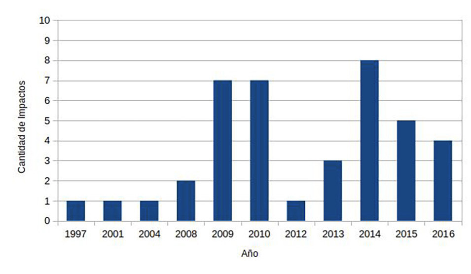 In the vertical axis the number of impacts is detailed and in the horizontal axis the year.