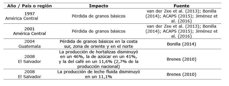 El primer impacto asociado con la agricultura según la literatura consultada, se registró en 1997, el cual reportó pérdida de granos básicos en América Central debido a la sequía (Cuadro 1) (van der Zee et al., 2013; Bonilla, 2014; ACAPS, 2015; Jiménez et al., 2016). Es importante destacar en este punto, que esta pérdida de granos básicos pudo estar directamente relacionada con el fenómeno del ENOS, puesto que en dicho año se reportó la presencia de la fase cálida del fenómeno (FAO, 2014). El mismo comportamiento se presentó en Guatemala en el año 2004, debido al fenómeno de El Niño, en donde la sequía o disminución de precipitaciones afectó la producción de granos básicos en la Costa Sur, Zona Oriente y Norte del país (Bonilla, 2014). Esta situación también se presentó a nivel regional en Guatemala, Honduras y Nicaragua, en donde se experimentó una reducción de la lluvia, afectando los cultivos de maíz, frijol y sorgo en las áreas de estos países que se encuentran inmersas dentro del CSC (ACF, 2010a; 2010b) (Cuadro 2).