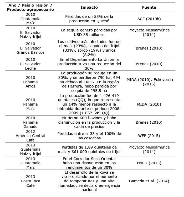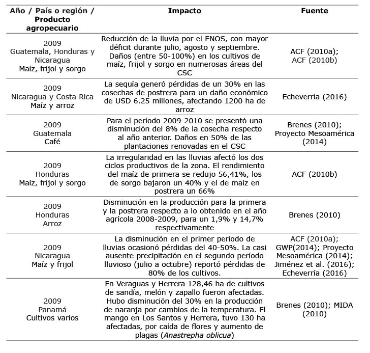 En el período comprendido entre los años 2009 y 2010, la sequía tuvo efectos adversos en el sector agropecuario de América Central (Cuadros 2 y 3); en ambos años, destaca también la presencia del fenómeno de El Niño. Dentro de los principales impactos, sobresalieron la pérdida de más de la mitad de los cultivos de maíz, frijol y sorgo en Guatemala, Honduras y Nicaragua (ACF, 2010a; 2010b), la afectación de los cultivos de granos básicos en El Salvador generaron un déficit de alrededor USD 28 millones (Brenes, 2010), la pérdida del 62% de la intención de siembra de arroz en Panamá (MIDA, 2010; Echeverría, 2016), entre otros.