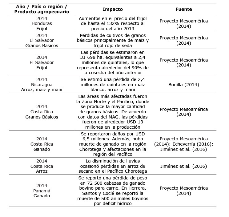 Aunque dentro de los años 2013 y 2014 no se presentó una manifestación concreta del fenómeno del ENOS (Null, 2017), la disminución de las precipitaciones sí tuvo efectos adversos en el sector agropecuario en América Central. Por ejemplo, en el año 2014, en Honduras, la sequía provocó pérdidas en la producción de frijol que se vieron reflejadas en un aumento en el precio del grano de un 132% (Proyecto Mesoamérica, 2014); también, se estimaron para ese período pérdidas cercanas a 2,4 millones de quintales de maíz blanco, arroz y maní en Nicaragua (Bonilla, 2014) y en Costa Rica, se reportaron daños en el sector ganadero por USD 6,5 millones, debido a la muerte de ganado en la región Chorotega y afectaciones en la región del Pacífico (Cuadro 4) (Proyecto Mesoamérica, 2014; Echeverría, 2016; Jiménez et al., 2016).