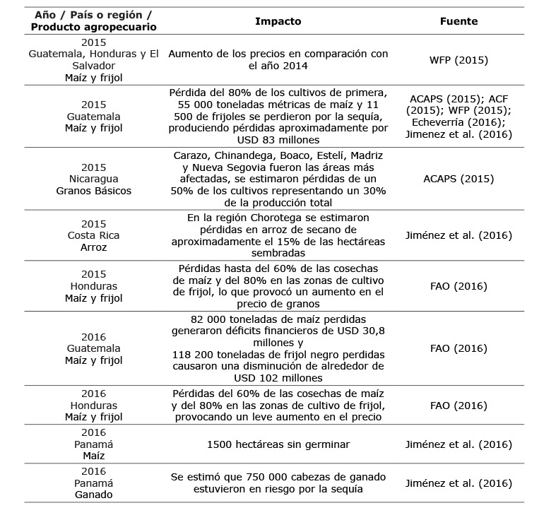 Durante los años 2015 y 2016 se dio una manifestación de la fase cálida del ENOS (Null, 2017), y tal como se aprecia en el Cuadro 5, hubo efectos significativos asociados a la disminución de la precipitación sobre el sector agropecuario en las regiones del CSC. Conforme a estas, llaman la atención la pérdida de 55 000 toneladas métricas de maíz y 11 500 de frijol en Nicaragua, generando pérdidas próximas a los USD 83 millones (ACF, 2015; WFP, 2015; ACAPS, 2015; Jiménez et al., 2016), 15% de las hectáreas de arroz secano sembrado en la región Chorotega de Costa Rica y la presencia de 750 000 cabezas de ganado en riesgo en Panamá debido a la sequía (Jiménez et al., 2016), por mencionar algunos.