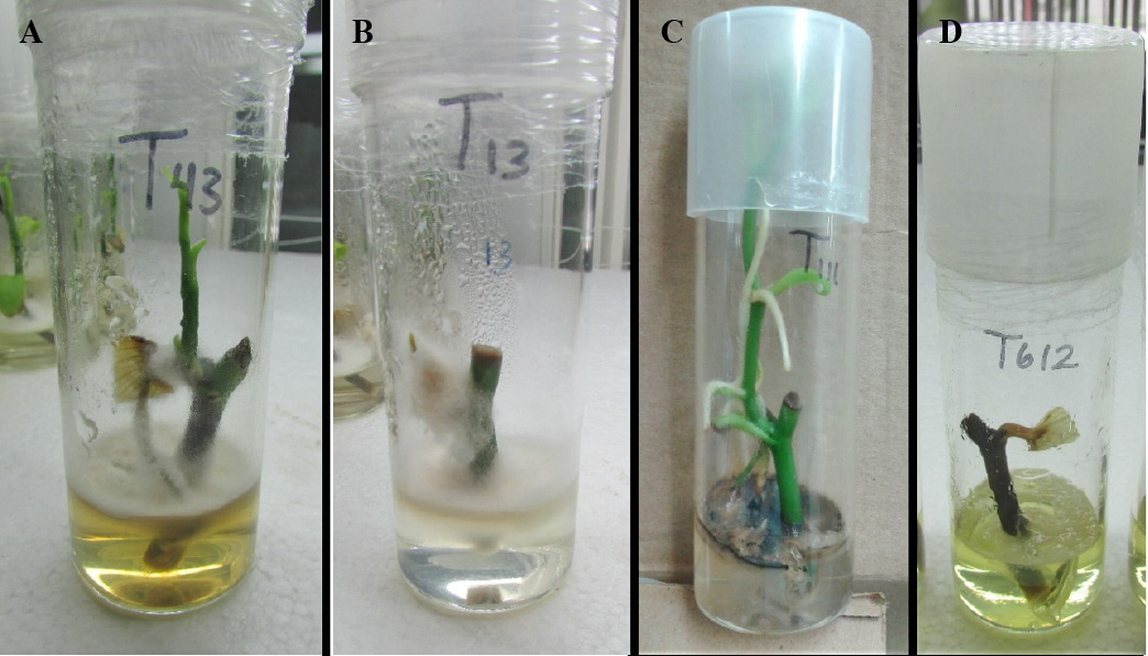 Las estacas infectadas con hongos fueron desechadas, pues en la mayoría de los aislamientos, ocasionaron la muerte de las plántulas in vitro, mientras que las contaminadas con bacterias se desinfectaron y subcultivaron para aumentar la cantidad de plantas para ensayos subsecuentes.