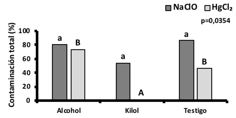 Para contaminación total no hubo diferencias significativas (p≥0,0586) entre los desinfectantes usados en invernadero seguido por la desinfección con NaClO en el laboratorio. Por el contrario, cuando el desinfectante en el laboratorio fue el HgCl2, posterior a la desinfección en invernadero, se presentaron diferencias entre el kilol respecto al alcohol y el testigo (p<0,0001), mientras que entre estos dos últimos tratamientos no hubo diferencias (p=0,1422).