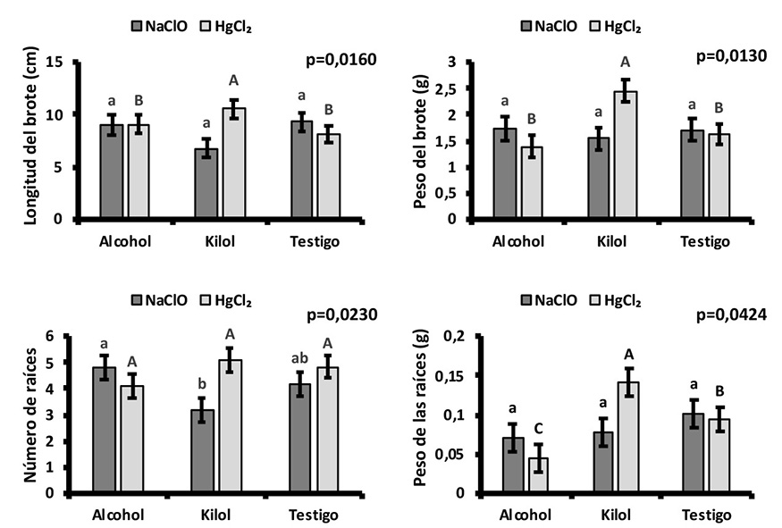 Para la variable peso de las raíces, kilol–HgCl2 presentó un 71% de aumento con relación a alcohol–HgCl2 (p=0,004). En el resto de las combinaciones no hubo diferencias significativas.