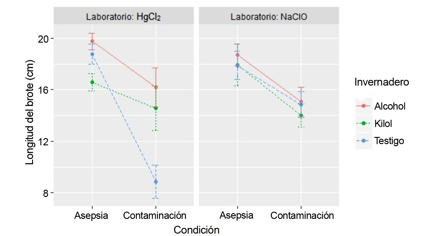 La longitud del brote presentó interacción significativa entre los tres factores (p=0,0167). Los valores más altos se obtuvieron a partir de los explantes desarrollados en la condición Asp durante el establecimiento (Figura 4). La mayor diferencia (55%) se presentó entre la combinación alcohol–HgCl2 de esta condición, respecto a la combinación testigo–HgCl2 de los brotes sanos obtenidos donde hubo contaminación (Cont) (p≤0,0001). Además, cuando la comparación se realizó entre los tratamientos de desinfección de invernadero (kilol, alcohol, testigo) con la desinfección con NaClO en laboratorio de la condición Cont, la mejor combinación del experimento presentó un incremento de al menos 24% (p=0,001). Para los brotes sanos obtenidos donde no presentó contaminación (Asp), no se presentaron diferencias significativas entre los tratamientos, excepto para alcohol–HgCl2, la cual presentó 16% más longitud en comparación con kilol–HgCl2 (p=0,035).