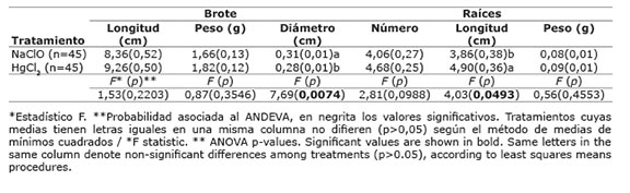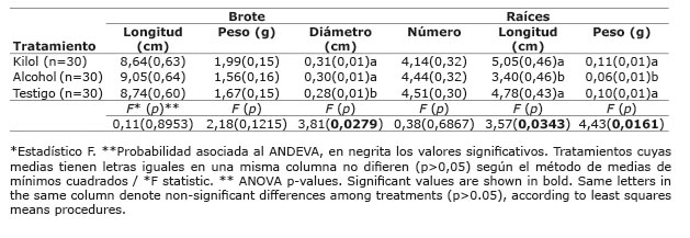 Para el caso de la variable número de raíces, la combinación kilol–HgCl2 obtuvo un 37% más raíces que kilol–NaClO, aunque no hubo diferencia significativa con respecto a alcohol o agua.