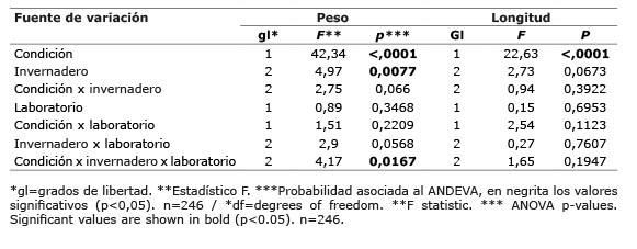 Las variables peso y longitud del brote presentaron diferencias significativas para el factor condición, las otras variables no presentaron diferencias significativas, excepto la variable longitud del brote para los factores Inv y la interacción Cond*Inv*Lab (Cuadro 3, Figura 4).
