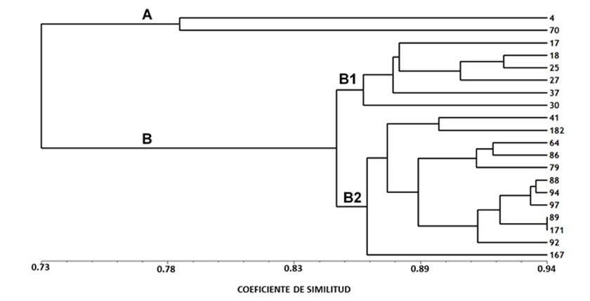 En las relaciones genéticas encontradas, se puede apreciar en el dendrograma (Figura 1), que a pesar de que el promedio general de similitud entre el total de las líneas fue alto, se formaron dos grupos (A y B), el A formado por las líneas 4 y 70, y el B con los dieciocho genotipos que completan este estudio. Los dos genotipos del grupo A, mostraron un coeficiente de similitud de 0,73 con respecto al resto de las líneas. Con respecto al grupo B, se apreció la formación de dos subgrupos (B1 y B2), en el subgrupo B2 se agruparon los genotipos 89 y 171, que por su alto índice de similitud de 94% podrían considerarse como duplicados (Figura 1). De igual forma, en este subgrupo B2, se tuvieron los materiales 88, 94 y 97, que fueron muy parecidos genéticamente a nivel molecular, morfológico y rendimientos estadísticamente iguales, por lo que, con base en estos criterios, podría considerarse su empleo indistintamente en los diferentes procesos de mejoramiento, y mezclarlos para ser usados como una variedad de polinización libre.