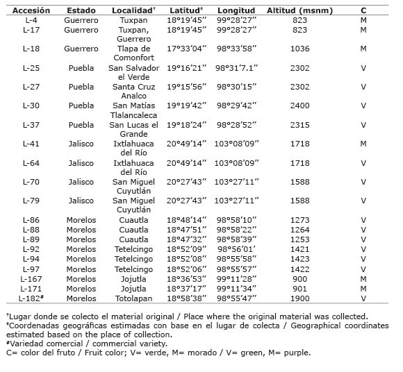 El germoplasma de tomate de cáscara (Physalis ixocarpa Brot.) tuvo diferentes procedencias (Cuadro 1). Las líneas fueron obtenidas a partir de individuos sobresalientes de poblaciones locales.