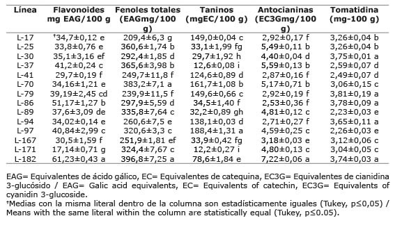 De las muestras de frutos colectados, se seleccionaron catorce líneas (Cuadro 2). Seis líneas no se consideraron para esta caracterización, debido a que tenían características físicas similares con otras líneas que provenían de la misma región geográfica (líneas 4, 18, 27, 64, 88 y 92; Cuadro 1). En cuatro frutos por línea se llevó a cabo la determinación de flavonoides por el método de Dewanto et al. (2002), fenoles totales se cuantificaron por la técnica propuesta por Singleton et al. (1999), con el empleo del reactivo de Folin-Ciocalteu. El contenido de fenoles totales se expresó como mg equivalentes de ácido gálico por 100 g de muestra seca (bs). Las antocianinas se determinaron de acuerdo con la técnica descrita por Lee et al. (2005) por diferencia de pH, y se expresaron como mg equivalentes de cianidina 3-glucósido por 100 g de muestra seca; los taninos se cuantificaron de acuerdo con la metodología descrita por Deshpande y Cheryan (1985) y se reportaron como mg equivalentes de (+)-catequina por 100 g de muestra. Finalmente, la tomatidina se determinó siguiendo el método de extracción sugerido por Laurila et al. (1999), pero con cromatografía líquida de alta resolución (HPLC). Se utilizó un estándar comercial de tomatidina (SIGMA) para identificar y calcular el contenido de este compuesto.