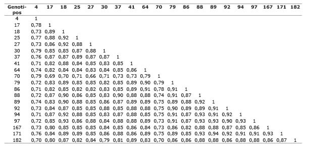 Cuadro 3. Matrix of genetic similarity between husk tomato (Physalis ixocarpa Brot.) genotypes, according to the DICE coefficient with AFLP markers. Celaya, Gto., Mexico. 2017.