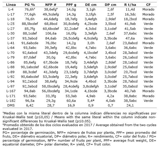 Table 4. Variables of agronomic importance determined in 20 advanced lines of husk tomato (Physalis ixocarpa Brot.) evaluated in the crop season spring-summer and autumn-winter, 2017. Celaya, Gto., Mexico.
