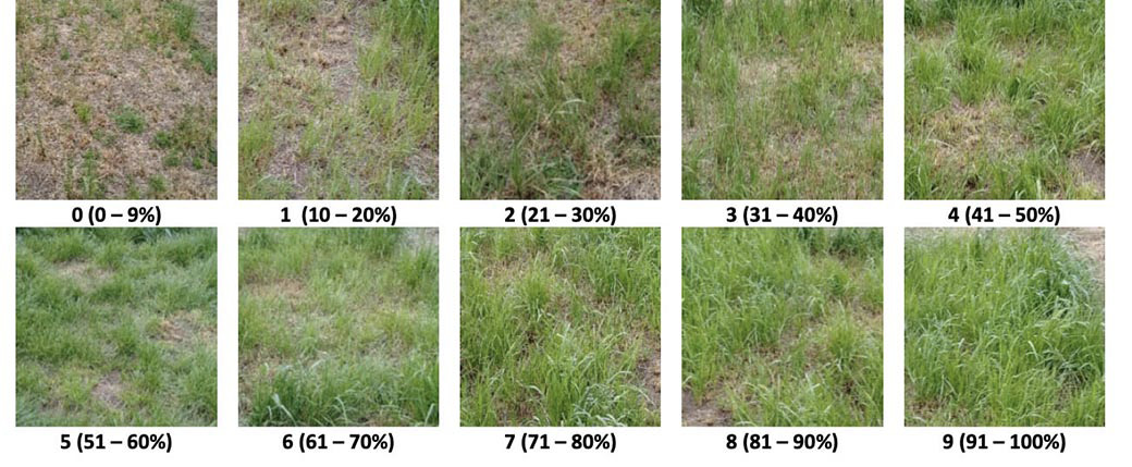 Figure 1. Scale (0-9) for estimation of the coverage percentage in Ryegrass (Lolium sp.) swards. Nariño, Colombia. 2016-2017.