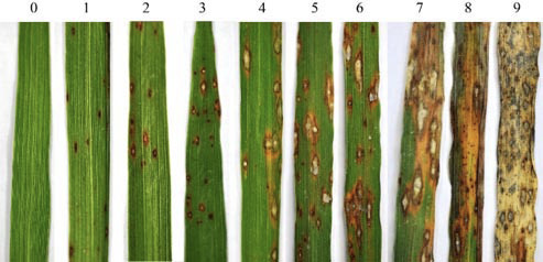 Figure 2. Scale for leaf spots severity (0-9) caused by Pyricularia grisea on Ryegrass (Lolium sp.) (ETHzürich, 2016).