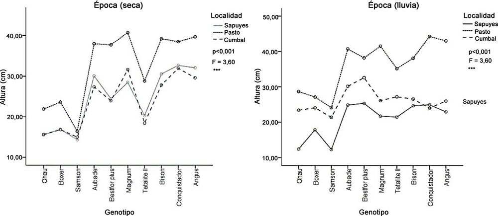 Se encontró para los genotipos y la edad de cosecha que, la mayor altura (cm) a los 25 días la presentó Angus (25,10); a los 30, 35 y 40 días Conquistador (32,33, 37,79 y 42,07, respectivamente), pero Angus (42,02) también fue de los más altos a los 40 días. Teniendo en cuenta la interacción genotipo x localidad x época, Conquistador (46,33) presentó la mayor altura en la localidad de Pasto en época lluviosa; en esta misma época se destacó Bestfor Plus con 32,60 cm en Cumbal y con 25,33 cm en Sapuyes. En la época seca, el genotipo con mayor altura (cm) fue Magnum (40,72) en la localidad de Pasto y Conquistador en Cumbal (31,95) y Sapuyes (32,64) (Figura 3).