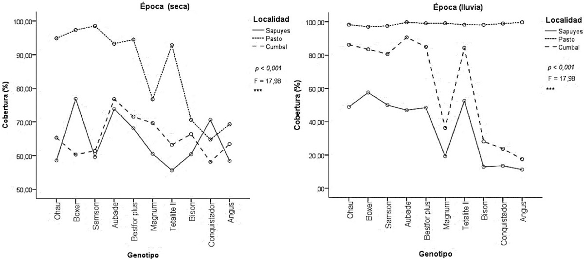 En cobertura se encontraron efectos altamente significativos de los factores genotipo, localidad, época y de las interacciones genotipo x localidad, genotipo x época de cosecha y genotipo x localidad x época.