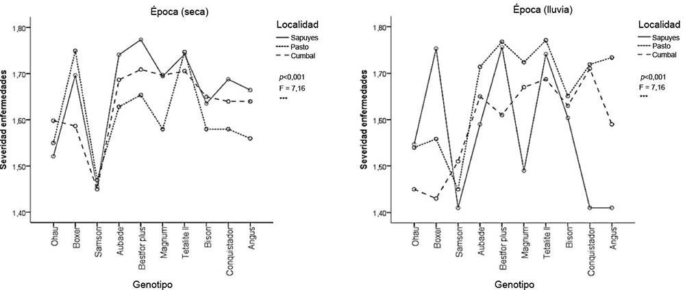 Los genotipos Samson (1,00), Conquistador (1,00) y Angus (1,00) presentaron la severidad más baja en la localidad de Sapuyes en época lluviosa. En esta misma época y en Cumbal sobresalió Boxer (1,06), y en Pasto el genotipo Samson (1,14). En época seca también se destacó el genotipo Samson, por presentar los valores más bajos de severidad en Cumbal (1,12), en Sapuyes (1,14) y en Pasto (1,18) (Figura 5).