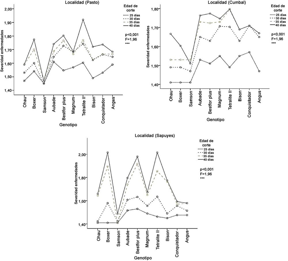 Figure 6. Genotype x locality x time of harvesting interaction for the severity of diseases variable for ten Ryegrass (Lolium sp.) genotypes evaluated in three localities of the high lands of Nariño, Colombia during dry and rainy seasons. 2016-2017.