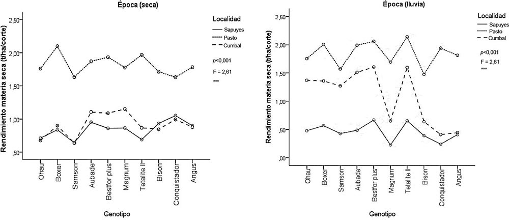 El rendimiento de materia seca (t/ha/corte) estuvo afectado (p<0,01) por los factores genotipo, localidad, época, edad de cosecha y por las interacciones genotipo x localidad, genotipo x época y genotipo x localidad x época.