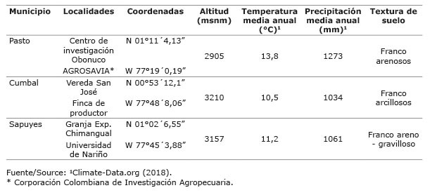 En el periodo comprendido entre febrero de 2016 y febrero de 2017, se establecieron tres experimentos en los municipios de Pasto, Cumbal y Sapuyes, con parámetros agroclimáticos promedio indicados en el Cuadro 1.