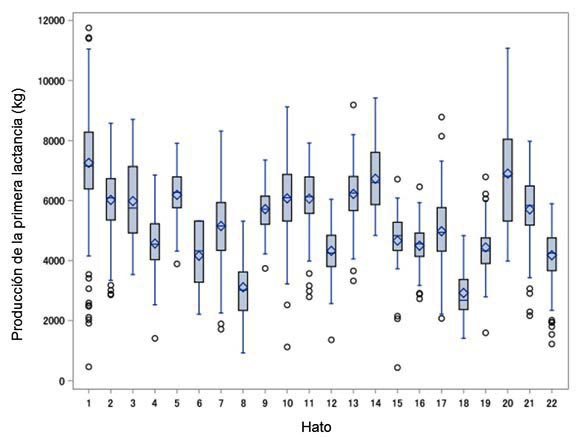 Figure 1. Box diagram for first lactation milk yield by herd of origin. Cohort retrospective study, of 2747 dairy cows of twenty-two milk farms of Costa Rica. First calving between 2013 and 2015.