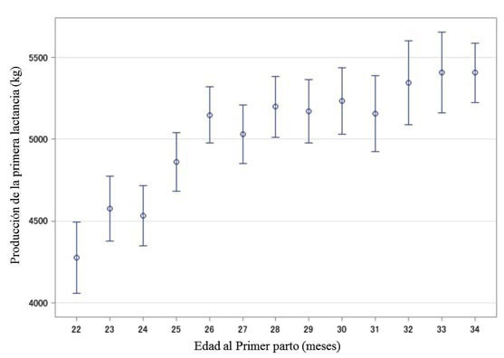 Para EPP se observó una tendencia marcada de incremento en la producción de leche conforme se aumenta la EPP (Figura 2). A partir de los 26 meses de EPP, la PPL tendió a estabilizarse. Los animales que parieron por primera vez a los 22 meses de edad, produjeron 1128,86 kg menos (PPL: 4278,1kg IC95%: 406,6-4495,7) que las vacas paridas con 34 meses de edad (PPL: 5407,0; IC95%: 5225,5-5588,5).