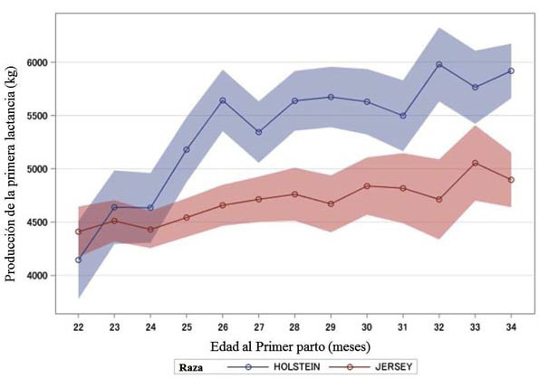 Al analizar el efecto de la EPP en interacción con la raza, se confirmó la tendencia mencionada anteriormente, de un incremento en la PPL conforme la EPP aumenta (Figura 3). Sin embargo, esta tendencia fue más marcada en las vacas Holstein, donde los animales con mayor EPP presentaron una mayor producción de leche en la primera lactancia (PPL: 5917,5 kg; IC95%: 5661,5-6173,4), y difirieron de forma significativa de las novillas que llegaron muy jóvenes al primer parto, que presentaron una producción de leche a 305 días de 4145,8 kg (IC95%: 3780,1-4511,7). Para la raza Jersey, la diferencia entre las novillas que parieron con 22 meses de edad (PPL: 4410,3; IC95%: 4174,8-4646,0) y las paridas con 33 meses (PPL: 5054,8; IC95%: 4701,3-5408,2), fue de 644 kg (Figura 3).